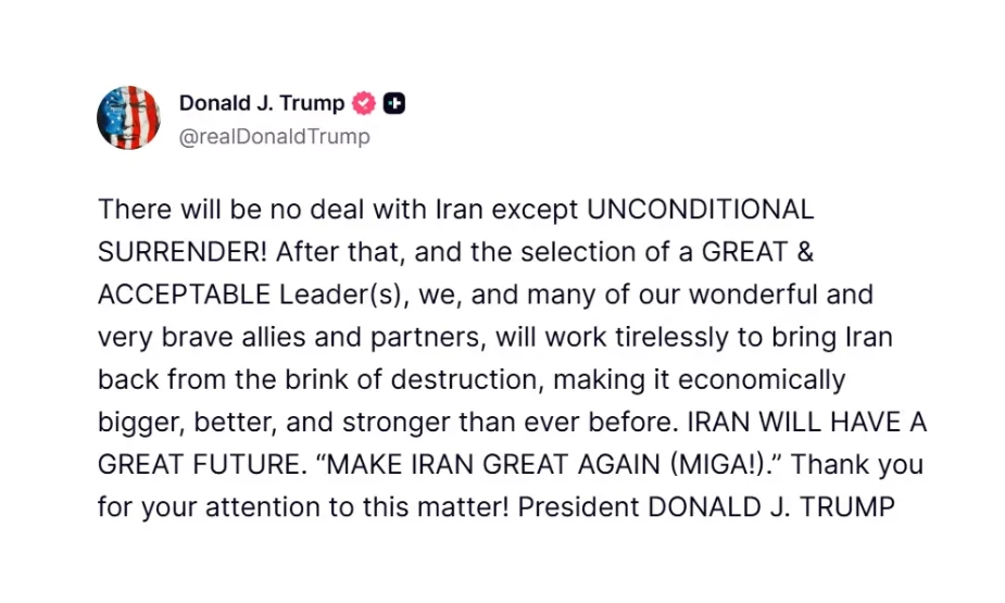 ترامپ: تنها راه توافق با ایران، تسلیم بیقید و شرط است